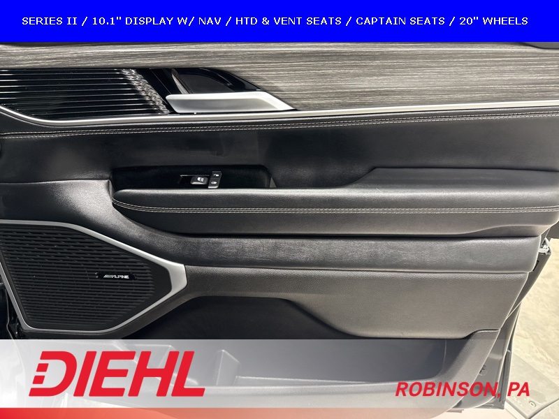 Inside, it feels less like an SUV and more like a private lounge on wheels. You get premium leather trimmed seating, heated and ventilated front seats, heated second row seats, heated steering wheel, power adjustable pedals with memory, and tri zone automatic climate control. The Uconnect 5 NAV system with a 10.1 inch touchscreen, Apple CarPlay, Android Auto, SiriusXM, 4G LTE WiFi hotspot capability, wireless charging pad, and Alpine premium audio system with subwoofer make every drive feel first class.