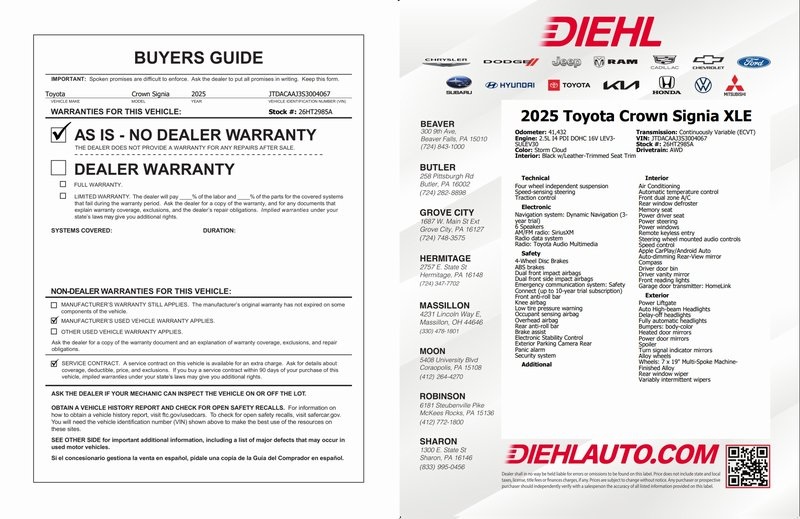 Recent Arrival! **ONE OWNER**, **CLEAN CARFAX**, **TOYOTA CERTIFIED**, **ALL WHEEL DRIVE**, **HEATED SEATS**, **COOLED SEATS**, **ADAPTIVE CRUISE CONTRL**, **BLIND SPOT DETECTION**, **FRONT CRASH DETECTION**, **BLUETOOTH**, **NAVIGATION**, **BACKUP CAMERA**, **PREMIUM WHEELS**, **ANDROID AUTO**, **APPLE CARPLAY*, Crown Signia XLE, AWD, Black w/Leather-Trimmed Seat Trim, 4-Wheel Disc Brakes, ABS brakes, Apple CarPlay/Android Auto, Auto High-beam Headlights, Automatic temperature control, Delay-off headlights, Exterior Parking Camera Rear, Front dual zone A/C, Fully automatic headlights, Heated front seats, Heated rear seats, Leather-Trimmed Seat Trim, Low tire pressure warning, Memory seat, Navigation system: Dynamic Navigation (3-year trial), Power driver seat, Power Liftgate, Remote keyless entry, Steering wheel mounted audio controls, Telescoping steering wheel, Tilt steering wheel.
