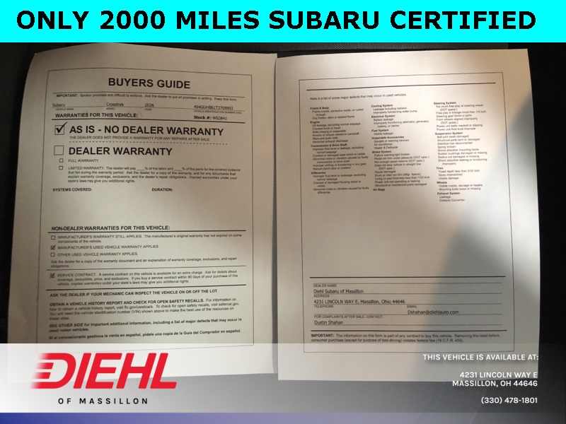2026 Subaru Crosstrek Alpine Green Lineartronic CVT 2.5L 4-Cylinder DOHC 16V AWD 26/33 City/Highway MPG